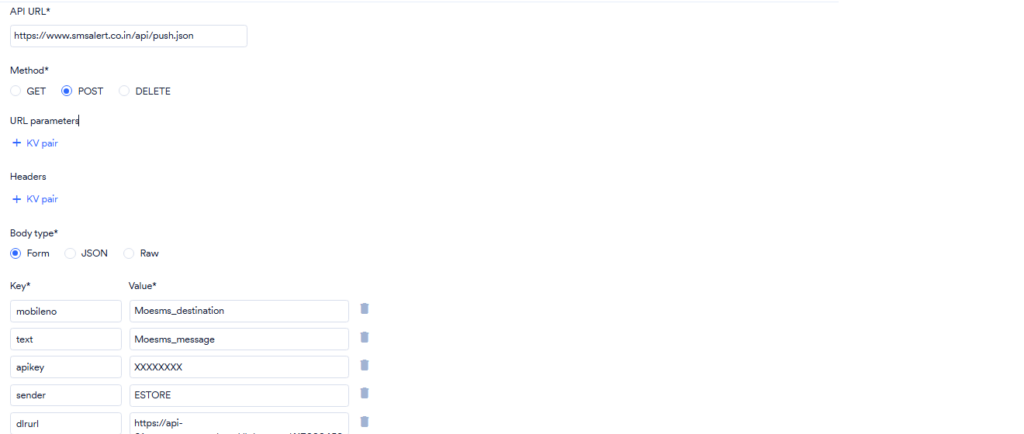 - Enter API URL as https://www.smsalert.co.in/api/push.json