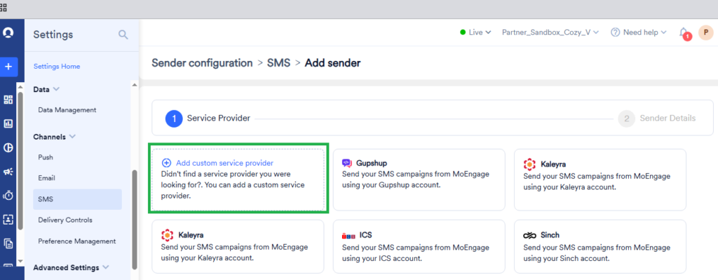 - Navigate to Settings >> Channels >> SMS in MoEngage dashboard