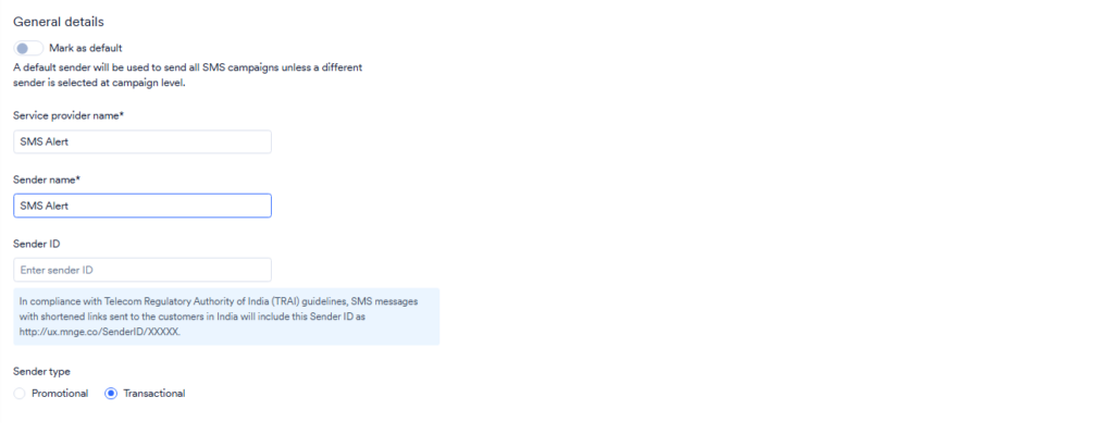 - Enter sender name as SMS Alert